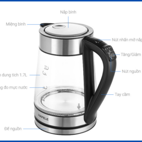 Điểm nổi bật của mẫu ấm này nằm ở chất liệu thủy tinh trong suốt kết hợp cùng thép không gỉ, mang lại cảm giác sạch sẽ, hiện đại và dễ quan sát mực nước khi đun.