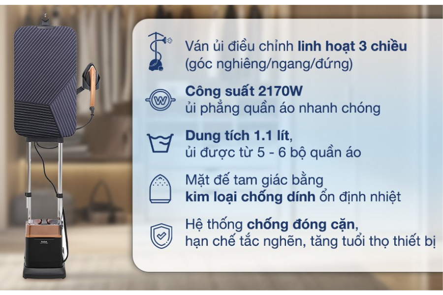 - Công suất 2170W làm nóng nhanh, tiết kiệm thời gian ủi quần áo
