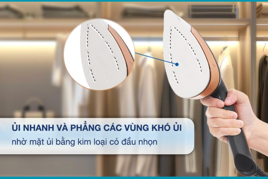 - 3 mức điều chỉnh hơi nước cùng đầu ủi nhọn và lớn để ủi chính xác hơn