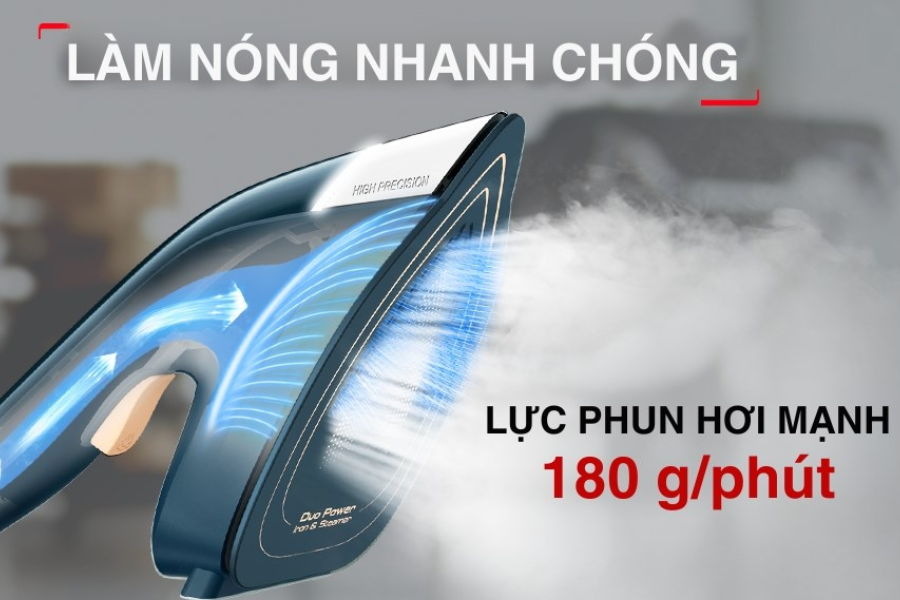 Một điểm đáng chú ý của Bàn ủi hơi nước cầm tay Tefal JF4032E0 là khả năng làm nóng nhanh ngay sau khi khởi động. Nhiệt độ được nâng lên đều và duy trì ổn định trong suốt quá trình sử dụng, giúp hơi nước phun ra liên tục và nhất quán. Điều này góp phần làm phẳng quần áo hiệu quả hơn, tránh tình trạng chỗ phẳng, chỗ còn nhăn. Việc duy trì nhiệt ổn định cũng giúp bảo vệ sợi vải tốt hơn, hạn chế nguy cơ làm hỏng quần áo do nhiệt độ tăng giảm đột ngột. Người dùng có thể yên tâm ủi nhiều trang phục liên tiếp mà không cần tắt máy để chờ làm nóng lại.