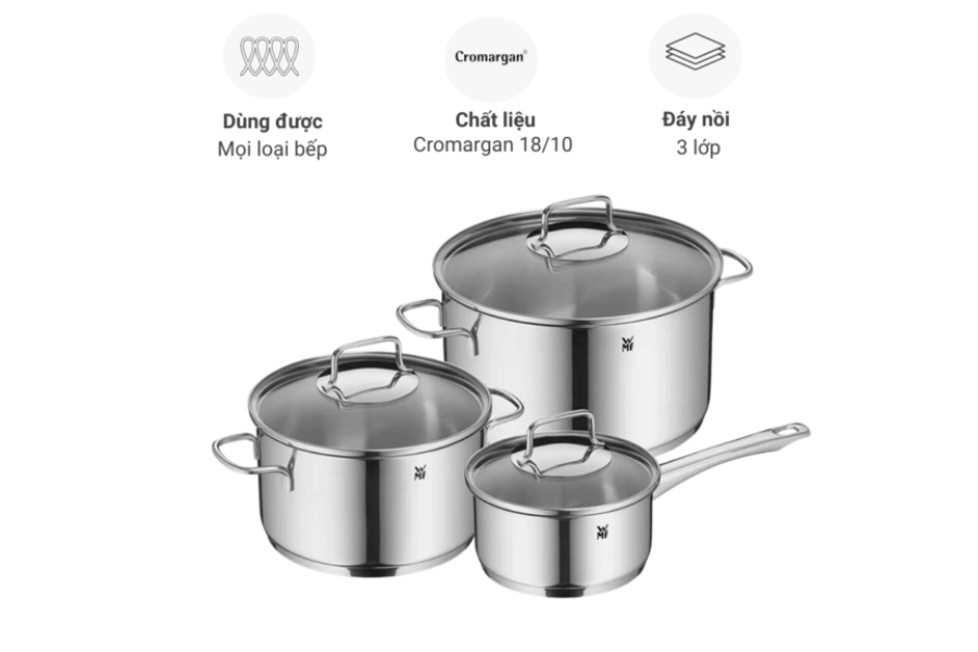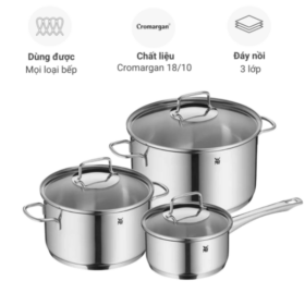 Bộ sản phẩm thường bao gồm 3 nồi với kích thước khác nhau, đáp ứng nhu cầu nấu canh, hầm, luộc hoặc kho trong gia đình 3–5 người. Với chất liệu thép không gỉ Cromargan® 18/10, bộ nồi mang đến khả năng chống ăn mòn, không phản ứng với thực phẩm và duy trì độ sáng bóng trong thời gian dài.