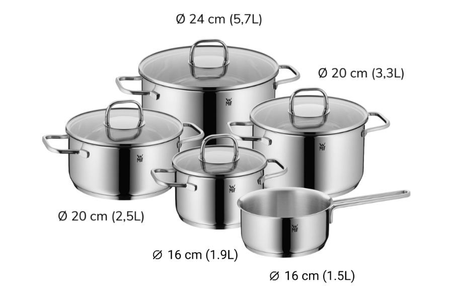 Sự kết hợp đa kích thước giúp Bộ nồi 5 món WMF INSPIRATION 1730556380 đáp ứng hầu hết nhu cầu nấu nướng trong gia đình, từ bữa ăn hàng ngày đến các dịp tụ họp đông người.