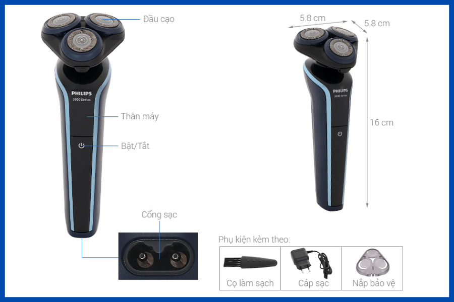 | Tiện ích | Hỗ trợ sạc nhanh Đèn LED hiển thị Có nắp đậy tiện bảo quản Chổi vệ sinh Đầu cạo độc lập, xoay 360° linh hoạt Sạc điện |