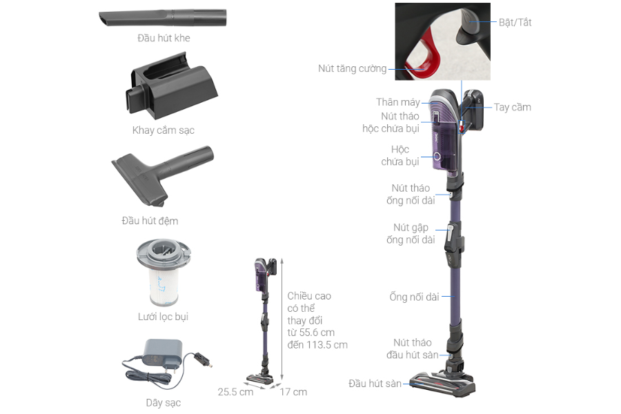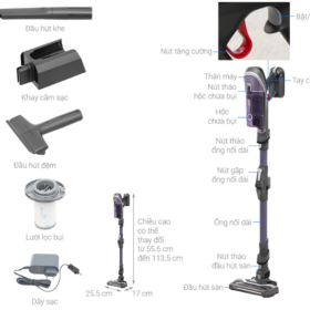 | Tính năng nổi bật | Thiết kế 2 trong 1, đầu hút có đèn LED |