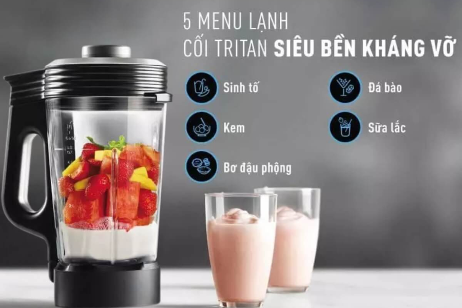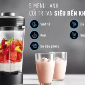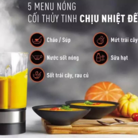 • Máy có một cối lớn thủy tinh và một cối bằng nhựa Tritan cứng cáp