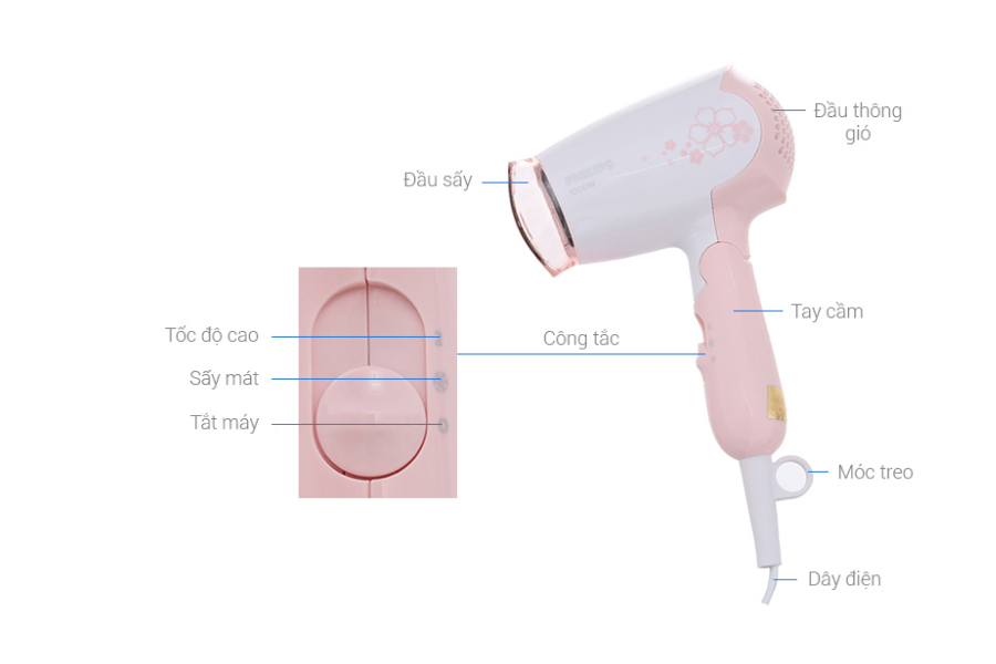 - Công suất 1000W sấy tóc nhanh khô, tiết kiệm thời gian