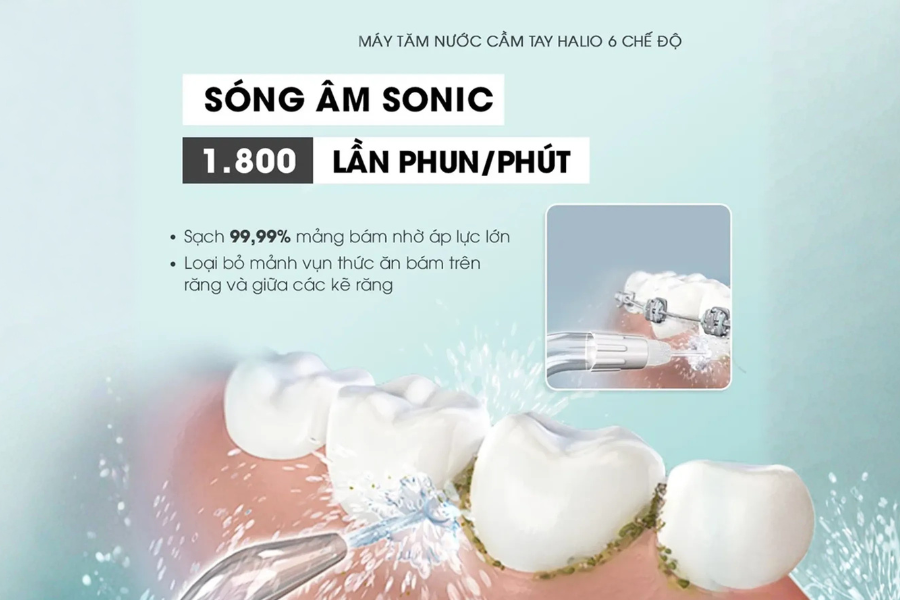 • Công nghệ sóng âm Sonic: Kết hợp áp lực nước và xung lực mạnh, làm sạch sâu kẽ răng mà không gây tổn thương nướu.