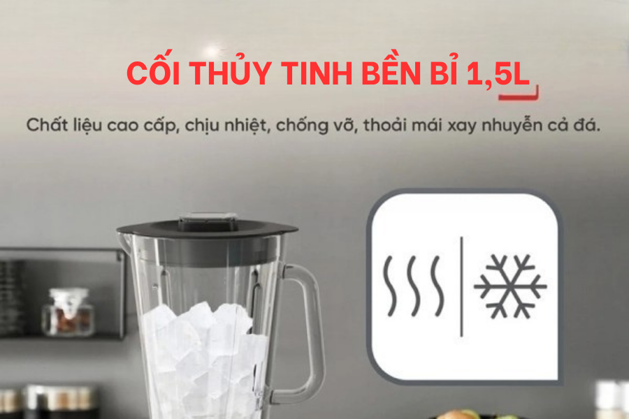Máy xay sinh tố Tefal BL871D31 sử dụng cối thủy tinh có dung tích 1.5 lít, chịu nhiệt cao và an toàn khi sử dụng với thức ăn nóng. Chất liệu thủy tinh cao cấp giúp xử lý hiệu quả các nguyên liệu lạnh, đảm bảo bạn có thể chế biến mọi loại đồ uống và món ăn mà không lo lắng về an toàn hoặc hiệu suất