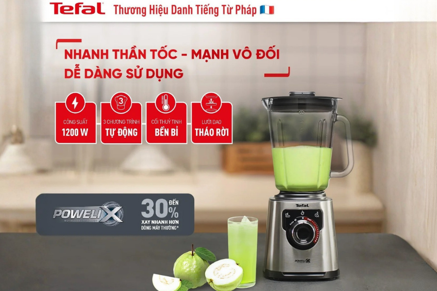 Với công suất 1200W, máy xay sinh tố Tefal BL871D31 của Tefal hoạt động mạnh mẽ, xay nhanh chóng và hiệu quả. Động cơ mạnh mẽ kết hợp với tốc độ quay lên đến 28.000 vòng/phút, đảm bảo kết quả hoàn hảo và thực phẩm được xay mịn màng, đáp ứng mọi nhu cầu từ sinh tố mát lạnh đến nghiền nhuyễn các nguyên liệu cứng như hạnh nhân.