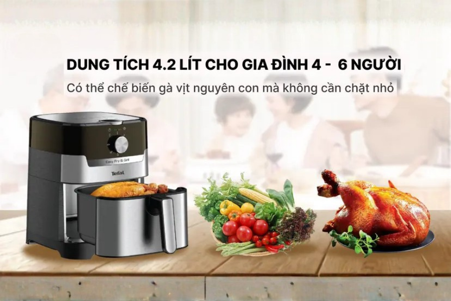 Nồi chiên không dầu Tefal EY501D15 có dung tích phù hợp cho gia đình từ 2 đến 6 thành viên. Dung tích này cho phép bạn chế biến lượng thực phẩm nhiều hơn trong một lần nấu, giúp phục vụ bữa ăn cho cả gia đình mà không phải chia nhỏ thực phẩm ra nhiều mẻ như trước đây. Điều này đặc biệt hữu ích khi bạn tổ chức bữa ăn vào dịp cuối tuần hoặc khi có khách.