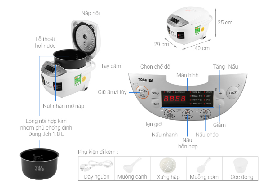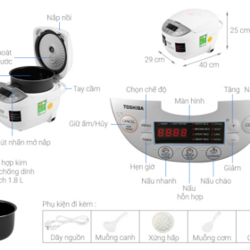 • Nồi cơm điện tử Toshiba RC-18DH2PV(W) dung tích 1.8 lít phù hợp với gia đình 3-4 người