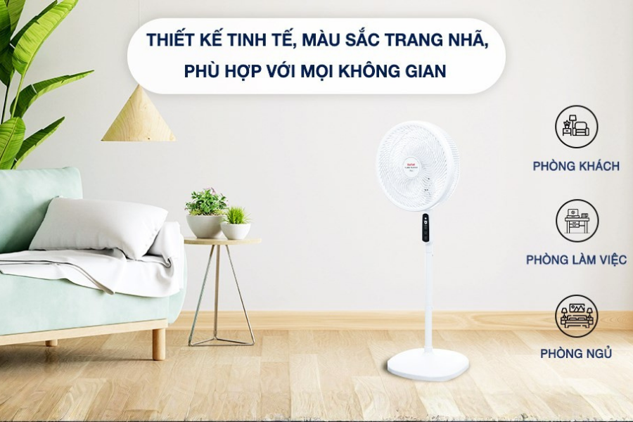 Quạt đứng Tefal TB Silence Plus VH689690-Trắng Cánh Trắng là lựa chọn linh hoạt cho nhiều không gian khác nhau. Trong phòng khách, quạt giúp tạo luồng gió mát dịu cho cả gia đình mà không gây ồn khi trò chuyện hay xem tivi. Với phòng ngủ, khả năng vận hành êm ái giúp duy trì giấc ngủ sâu, không bị gián đoạn bởi tiếng quạt. Ngoài ra, sản phẩm cũng rất phù hợp với văn phòng nhỏ, phòng làm việc tại nhà hoặc phòng học, nơi cần sự yên tĩnh nhưng vẫn đảm bảo không khí mát mẻ, dễ chịu.