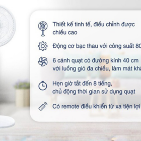 • Tích hợp chức năng hẹn giờ mở/tắt tiện lợi, thân quạt có thể điều chỉnh chiều cao.