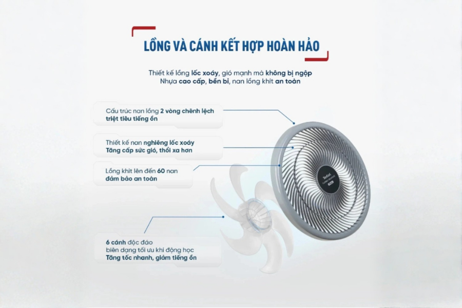 - Lồng quạt nhựa cao cấp, nan lồng kín khít an toàn, sức gió mạnh 6.0 m/s